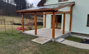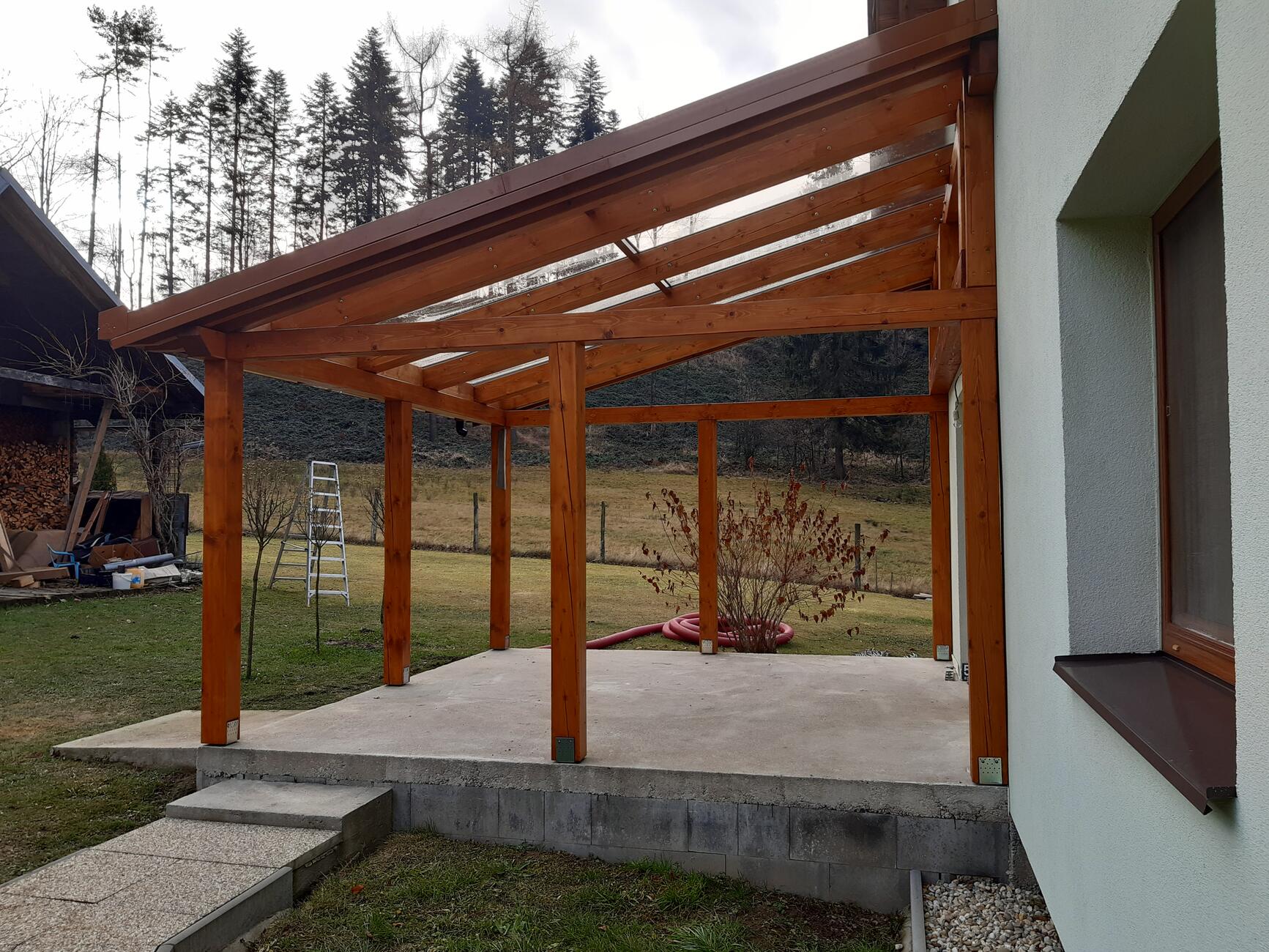 Atypické zasklení pergoly dvojsklem. Pergola je připravena k doplnění svislých prosklených stěn a vytvoření obytné místnosti