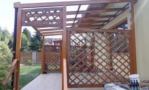 Replika doslouživší otevřené dřevěné pergoly prosklenou hliníkovou pergolou