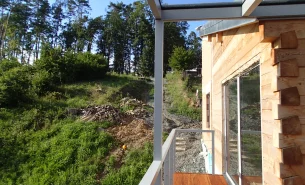Řešeno sesedání dřevostavby. Mezi sloupky pergoly doplněnho lankové zábradlí s hliníkovým madlem