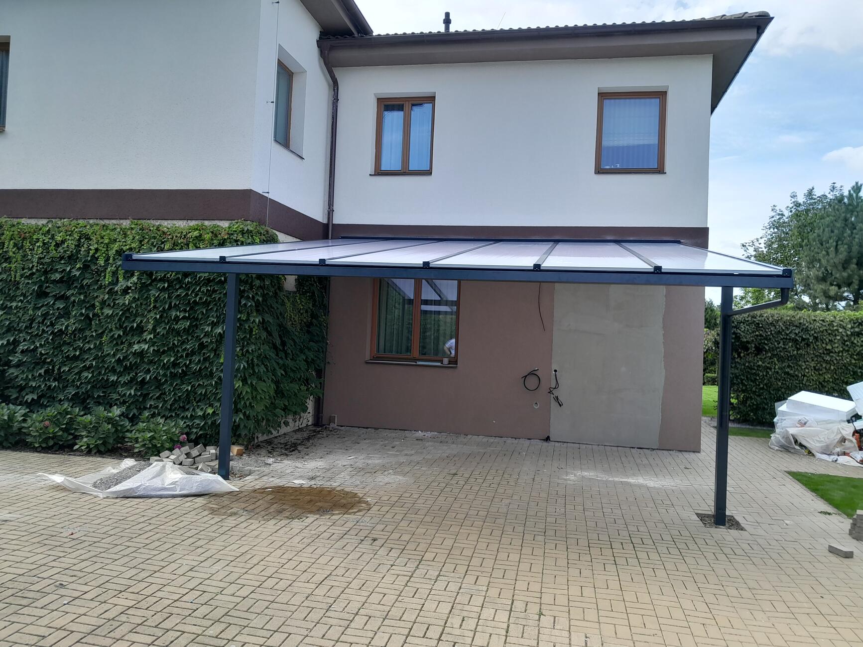 Pergola pro stání aut. Sloupky podpůrné konstrukce nejsou na straně pod žlabem, ale zapuštěny v 1/3 hloubky pergoly