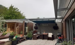 Pergola kryjící relaxační zónu na nádvoří rodinného domu