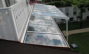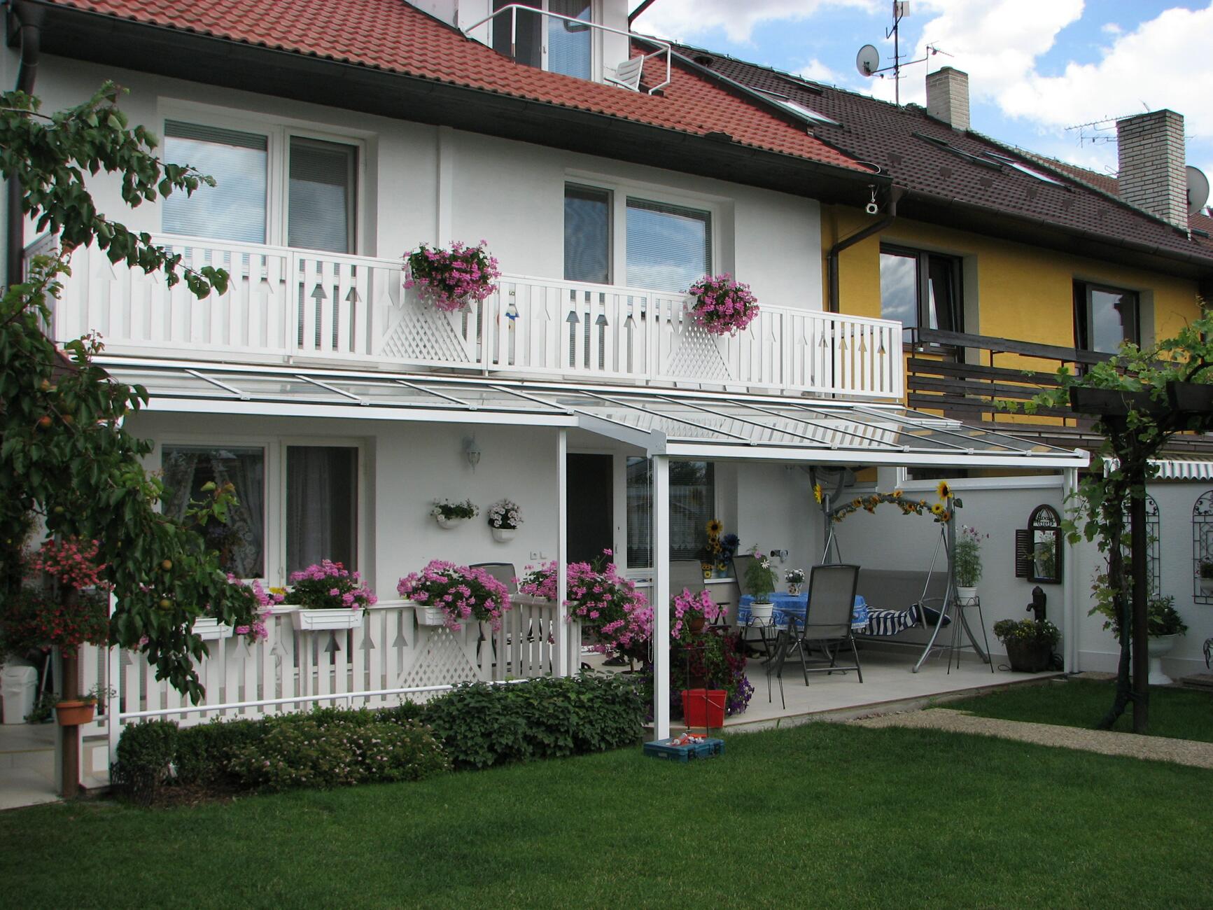 Prosklená pergola na terase v zahradě rodinného domu