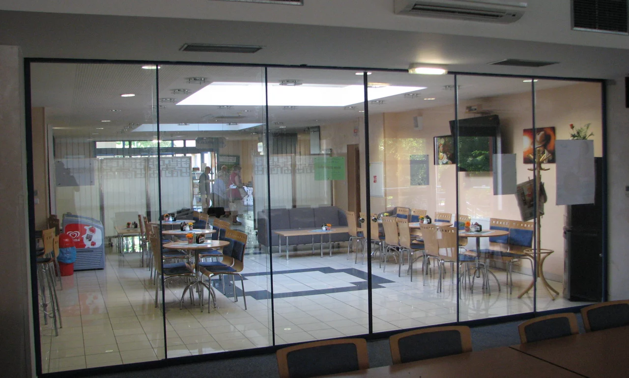 Oddělení konferenčního sálu od jídelny. Včetně svislého kartáče v subtilní hliníkové liště pro lepší zvukovou izolaci