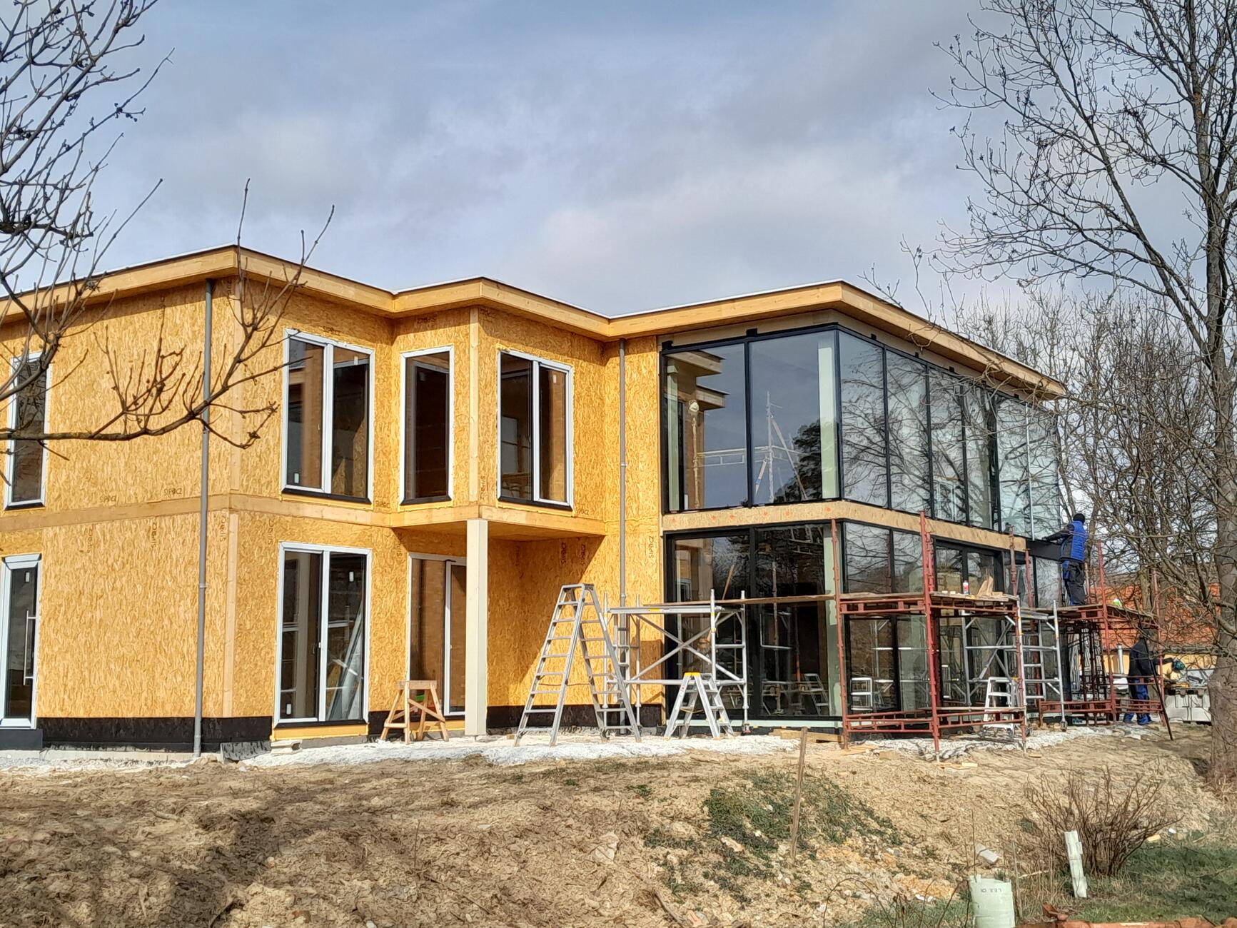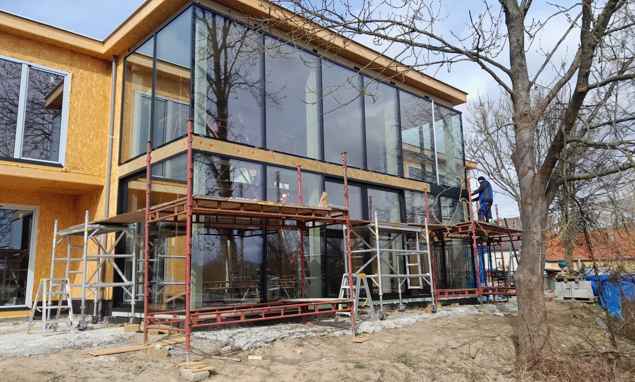 Dvoupodlažní fasáda dřevostavby. Výstup do zahrady zdvižně posuvným portálem